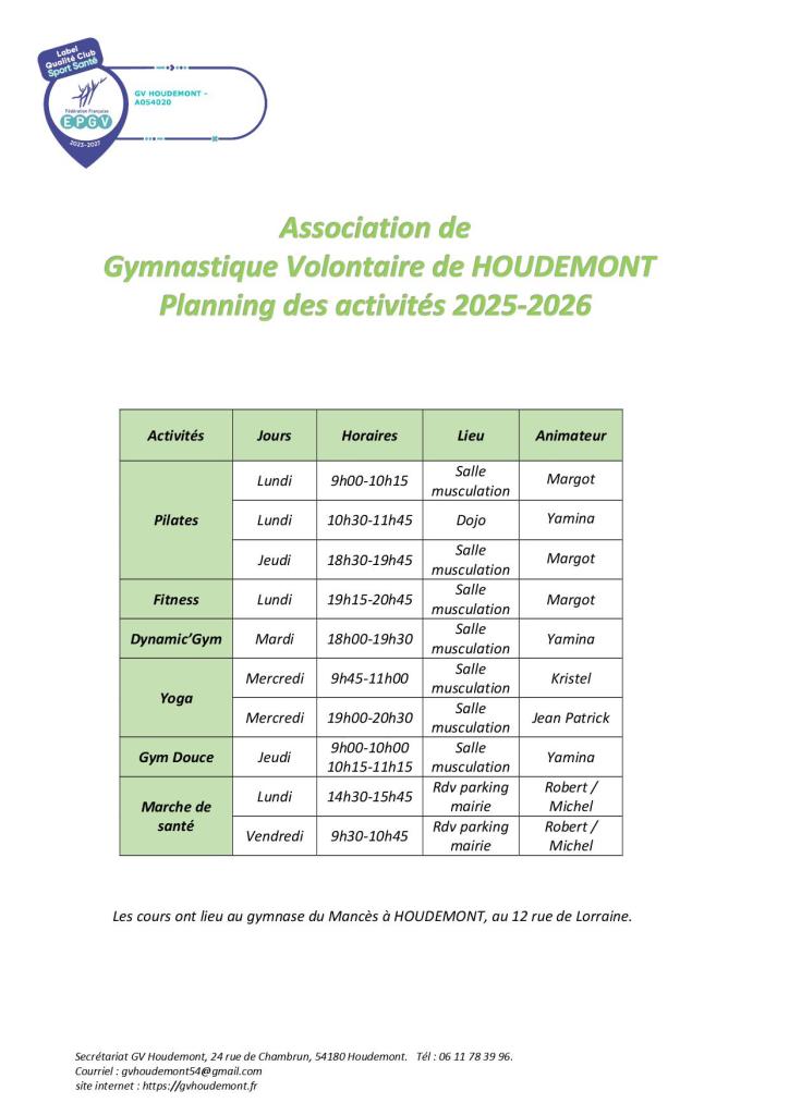 ACTIVITÉS de l’Association de Gymnastique Volontaire de HOUDEMONT saison 2025-2026